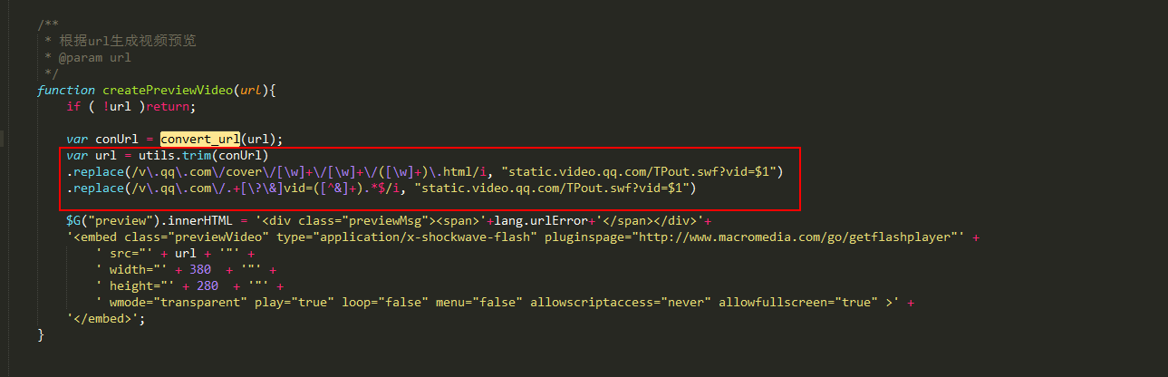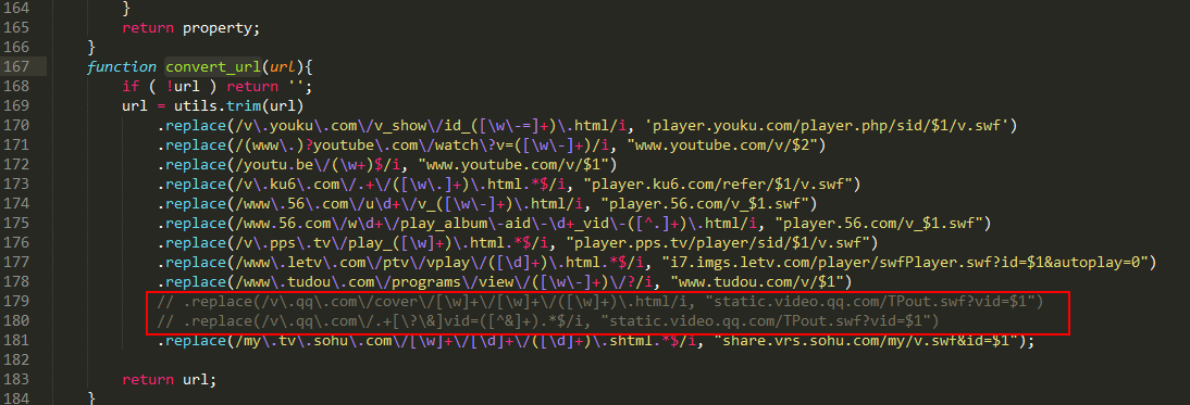 第二,找到dialogs/video/video.js文件,将convert_url方法里面的匹配方法注释掉,我注释了腾讯视频的,这个看需求,如下图:
