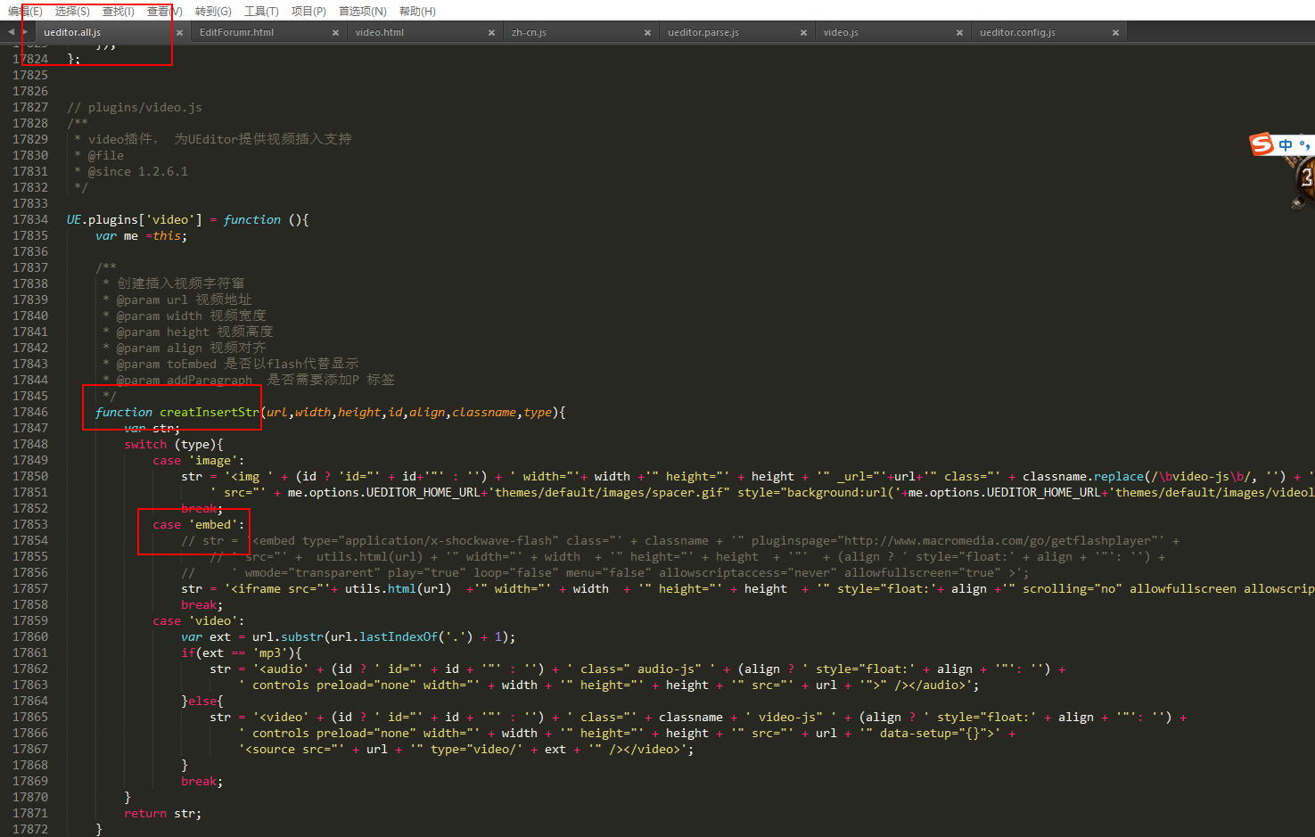 首先要做的是,找到ueditor.all.js文件,然后找到creatInsertStr方法里的embed区间,将原本的str注释 ,换成<iframe>标签的html,具体如下图所示: