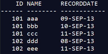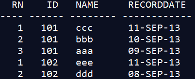 SELECT ROW_NUMBER() OVER(PARTITION BY T.ID ORDER BY T.NAME DESC) RN, T.ID, T.NAME, T.RECORDDATE FROM T_1 T;
