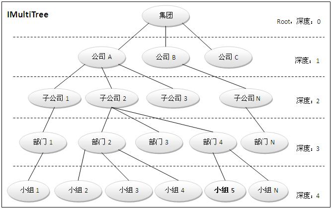 很明显,这种体系结构就是一个多叉树。我设计了ESBasic.ObjectManagement.Trees.Multiple.IMultiTree来抽象多叉树,其提供了很多简便的方法让我们对多叉树进行节点查询和操作。