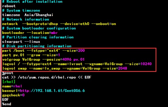 logvol swap –name=lv_swap –vgname=VolGroup –size=2048:从卷组VolGroup中划分2G的空间制作为逻辑卷用于swap分区,逻辑卷的名称为lv_swap。