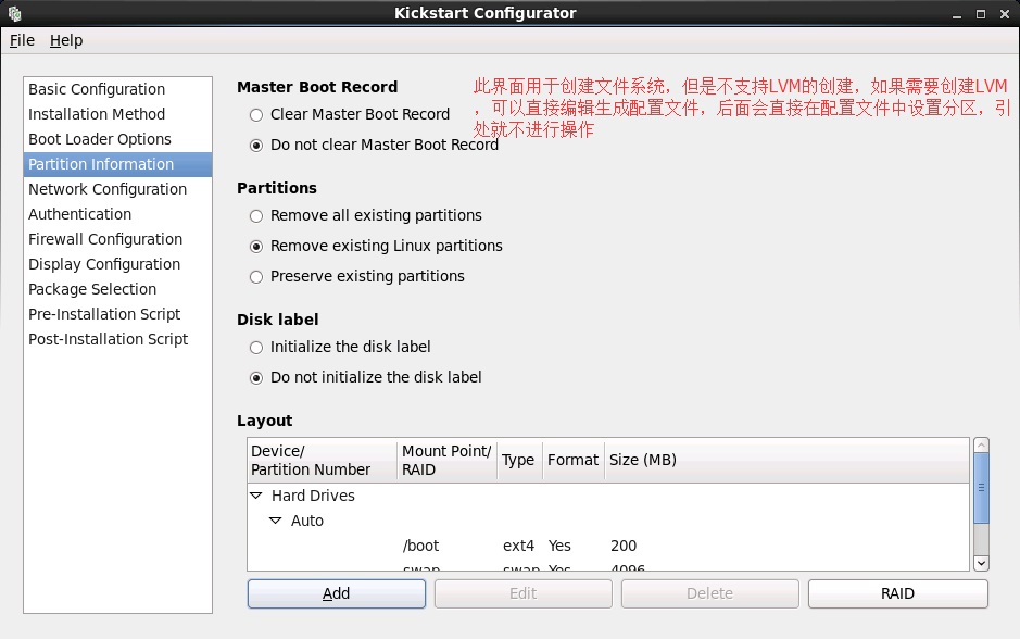 clearpart –linux –drivers=sda:表示清除sda上所有Linux分区;
