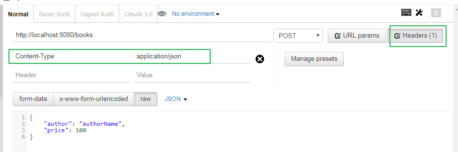 之前使用postman 插件调试rest接口总报 415 Unsupported Media Type错误, 原因是: HEADERS中必须设置Content-type为application/json, 后台才能顺利接收到参数. 见下图截图.