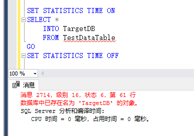 SET STATISTICS TIME ON SELECT * INTO TargetDB FROM TestDataTable GO SET STATISTICS TIME OFF