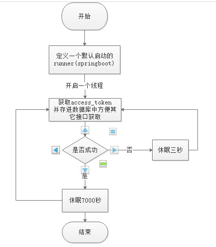 //开启一个线程 new Thread(new Runnable() { public void run() { try { while(true){ accessToken = getAccessToken(appId,appSecret); if(AccessTokenInfo.accessToken != null){ Thread.sleep(7000*1000); }else{ Thread.sleep(1000*3); } } } catch (Exception e) { System.out.println("发生异常:" + e.getMessage()); e.printStackTrace(); try { Thread.sleep(1000 * 10); //发生异常休眠1秒 } catch (Exception e1) { } } } }).start(); } private AccessToken getAccessToken(String appId,String appSecret) throws ClientProtocolException, IOException{ NetWorkHelper netHelper = new NetWorkHelper(); /** * 接口地址为https://api.weixin.qq.com/cgi-bin/token?grant_type=client_credential& * appid=APPID&secret=APPSECRET, * 其中grant_type固定写为client_credential即可。 */ String Url = String.format("https://api.weixin.qq.com/cgi-bin/token?" + "grant_type=client_credential&appid=%s&secret=%s", appId, appSecret); String result = netHelper.getHttpsResponse(Url, ""); System.out.println("获取到的access_token="+result); JSONObject json = JSON.parseObject(result); AccessToken token = new AccessToken(); token.setAccessToken(json.getString("access_token")); token.setExpiresin(json.getInteger("expires_in")); return token; } }