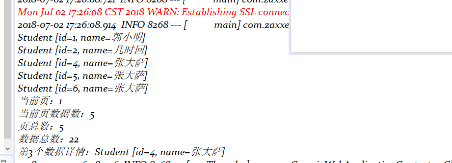 1 package com.xm; 2 3 import java.util.List; 4 5 import org.junit.Test; 6 import org.junit.runner.RunWith; 7 import org.springframework.beans.factory.annotation.Autowired; 8 import org.springframework.boot.test.context.SpringBootTest; 9 import org.springframework.test.context.junit4.SpringRunner; 10 11 import com.github.pagehelper.Page; 12 import com.github.pagehelper.PageHelper; 13 import com.xm.mapper.StudentMapper; 14 import com.xm.pojo.Student; 15 16 @RunWith(SpringRunner.class) 17 @SpringBootTest 18 public class StudentTest { 19 @Autowired 20 private StudentMapper studentMapper; 21 22 23 24 @Test 25 public void pageText() { 26 Page page = PageHelper.startPage(1, 5); 27 List<Student> students = studentMapper.list(); 28 for(Student student : students) { 29 System.out.println(student.toString()); 30 } 31 System.out.println("当前页:"+page.getPageNum()); 32 System.out.println("当前页数据数:"+page.getPageSize()); 33 System.out.println("页总数:"+page.getPages()); 34 System.out.println("数据总数:"+page.getCountColumn()); 35 System.out.println("第3个数据详情:"+page.get(2)); 36 } 37 38 39 }
