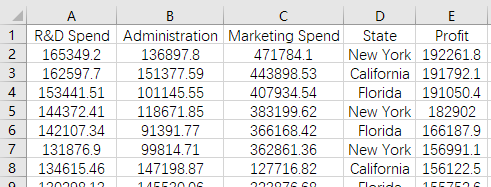 #导入库 import pandas as pd import numpy as np #导入数据集 dataset = pd.read_csv('50_Startups.csv') print(dataset[:10]) X = dataset.iloc[ : , :-1].values Y = dataset.iloc[ : , 4].values #将类别数据数字化 from sklearn.preprocessing import LabelEncoder, OneHotEncoder labelencoder = LabelEncoder() X[ : , 3] = labelencoder.fit_transform(X[ : , 3]) onehotencoder = OneHotEncoder(categorical_features = [3]) X = onehotencoder.fit_transform(X).toarray()