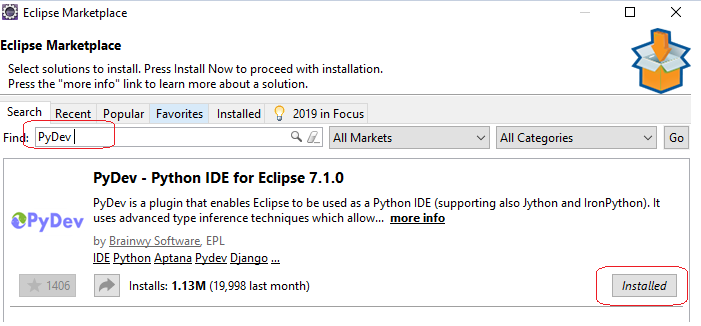 1.启动Eclipse后,从顶部菜单Help-->Eclipse Marketplace--->在Find旁边输入PyDev,在下面列出找到的PyDev插件,然后点Install(我这里已经安装好了)