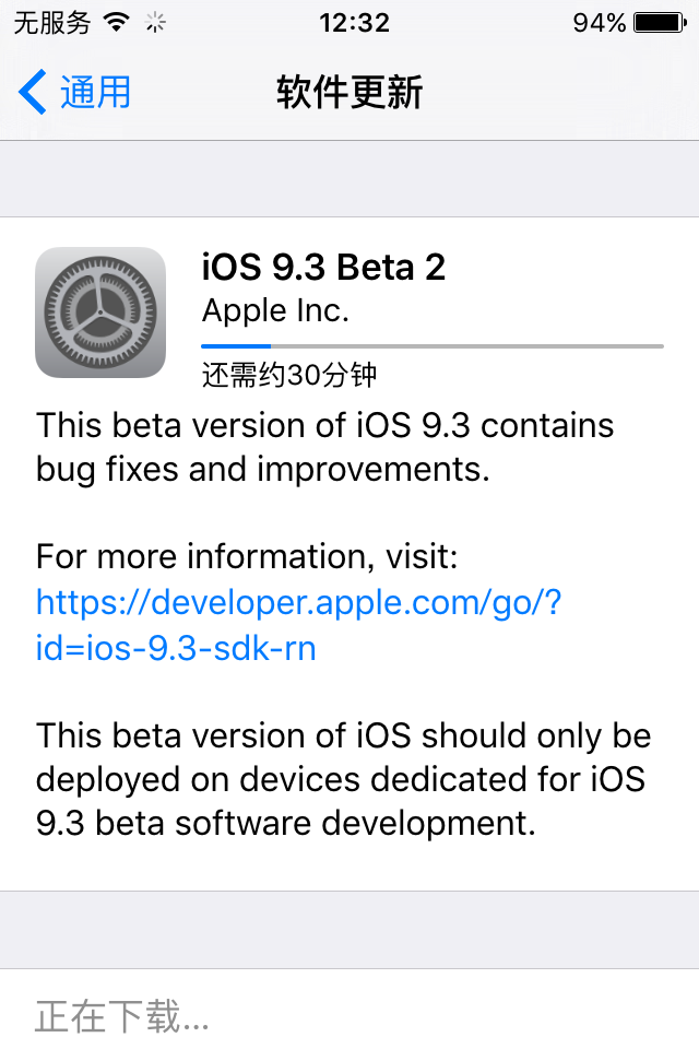 2、打开设置-通用-软件更新,即可看到iPhone正在下载iOS9.3 beta2,等待下载完成点击【现在安装】即可把iPhone升级到最新的iOS9.3 beta版。