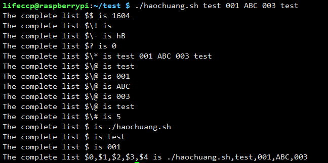 所有参数列表。如"$@"用「"」括起来的情况、以"$1" "$2" … "$n" 的形式输出所有参数。