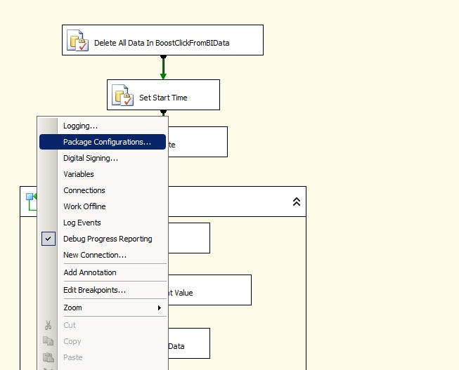 2. 将SSIS包中需要动态改变的配置导出config文件,比如数据库的连接字符串等, 在包的work flow的空白处右键,选择包配置