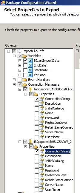 3. 勾选启用包配置, 添加一个xml的config文件, 然后选择需要放到config中动态配置的属性,此处我选择了一个自定义变量和两个db的连接字符串