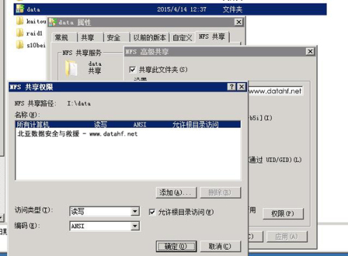 重启完成后我们对存放镜像数据的文件夹进行操作,右键—NFS共享标签页里面勾选共享此文件夹,然后有个重点是在权限里面勾选允许根目录访问,访问类型选择读写。