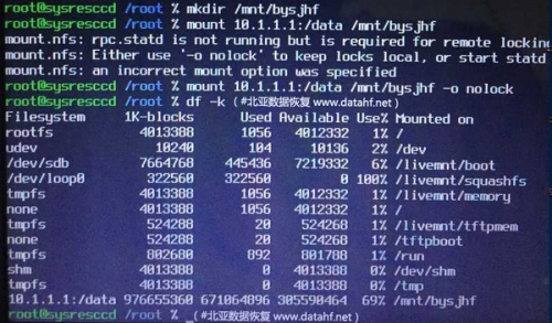 创建好之后,我们将镜像出来的数据挂载到linux下新创建的文件夹下mount 10.1.1.1:/data /mnt/bysjhf –o nolock