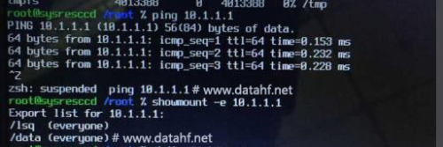 再查看10.1.1.1机器上的NFS共享的目录是否能够访问,命令:showmount –e 10.1.1.1,