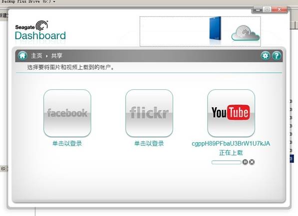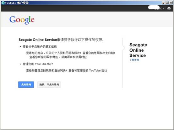 默认状态下支持facebook、flickr、youtube三项应用,当然,需要先登录你的对应的三个账户才可以用。Seagate Online Service会申请获得你的帐户操作权限。你点击"允许访问"之后,就可以开工了。这里先试试国际视频分享网站youtube。如图所示。