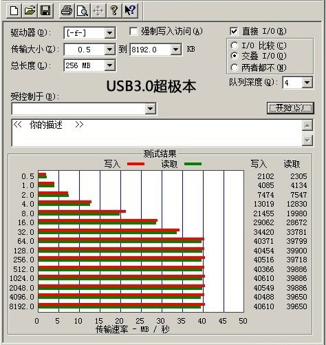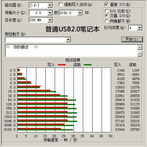笔者分别在两款笔记本电脑下做了读写测试。一台为普通的USB2.0笔记本,另一台为USB3.0的超极本。结果如下。