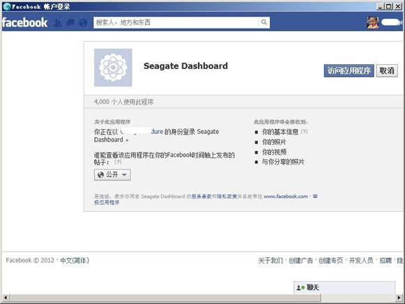 最后是Facebook,和上述应用一样,也是需要先允许Seagate Dashboard获得你的权限,然后你发帖子也好,更新照片也罢,都可以在软件界面操作了。