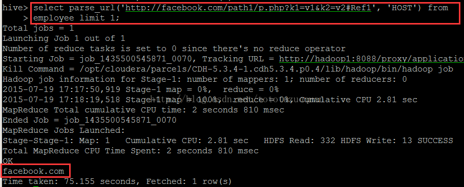 select parse_url(‘http://facebook.com/path1/p.php?k1=v1&k2=v2#Ref1‘, ‘HOST‘) from