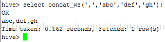 hive> select concat_ws(‘,‘,‘abc‘,‘def‘,‘gh‘) from lxw_dual;