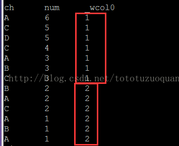 select ch, num, rank() over(partition by ch order by num) as rank from taborder;