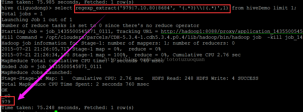 hive> select regexp_replace(‘979|7.10.80|8684‘, ‘(.*?)\\|(.*)‘,1) from hiveDemo limit 1;