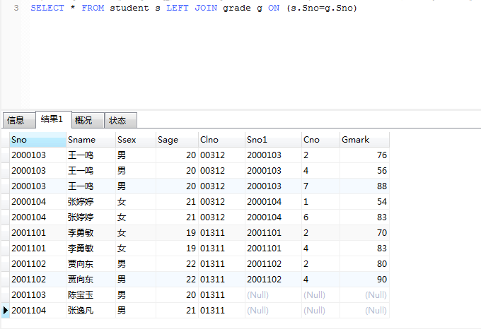 有两个没有选择课程和成绩,这样结果集也能得到谁没有选择课程