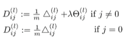 因为第一层是输入变量,不存在误差。我们有了所有的误差的表达式之后,便可以计算代价函数的偏导数了,假设λ=0,即我们不做任何归一化处理时有: