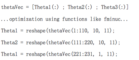 在Octave或者Matlab中,如果我们使用 fminuc 这样的优化算法求解求出权重矩阵,我们需要将矩阵首先展开为向量,再利用算法求出最优解后再重新转换回矩阵。