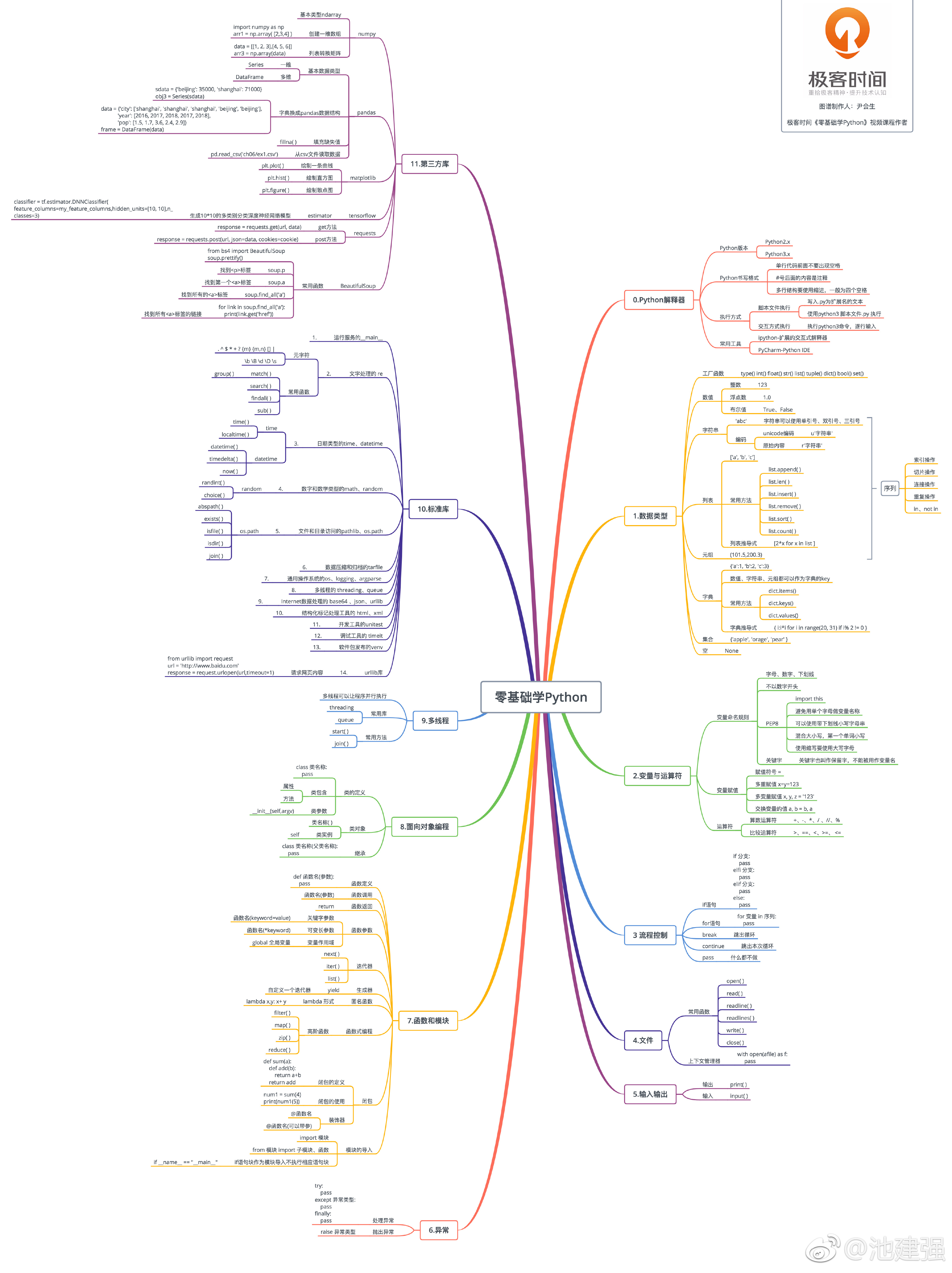 - 首先,按顺序依次展示了以下内容的一系列思维导图:基础知识,数据类型(数字,字符串,列表,元组,字典,集合),条件&循环,文件对象,错误&异常,函数,模块,面向对象编程;