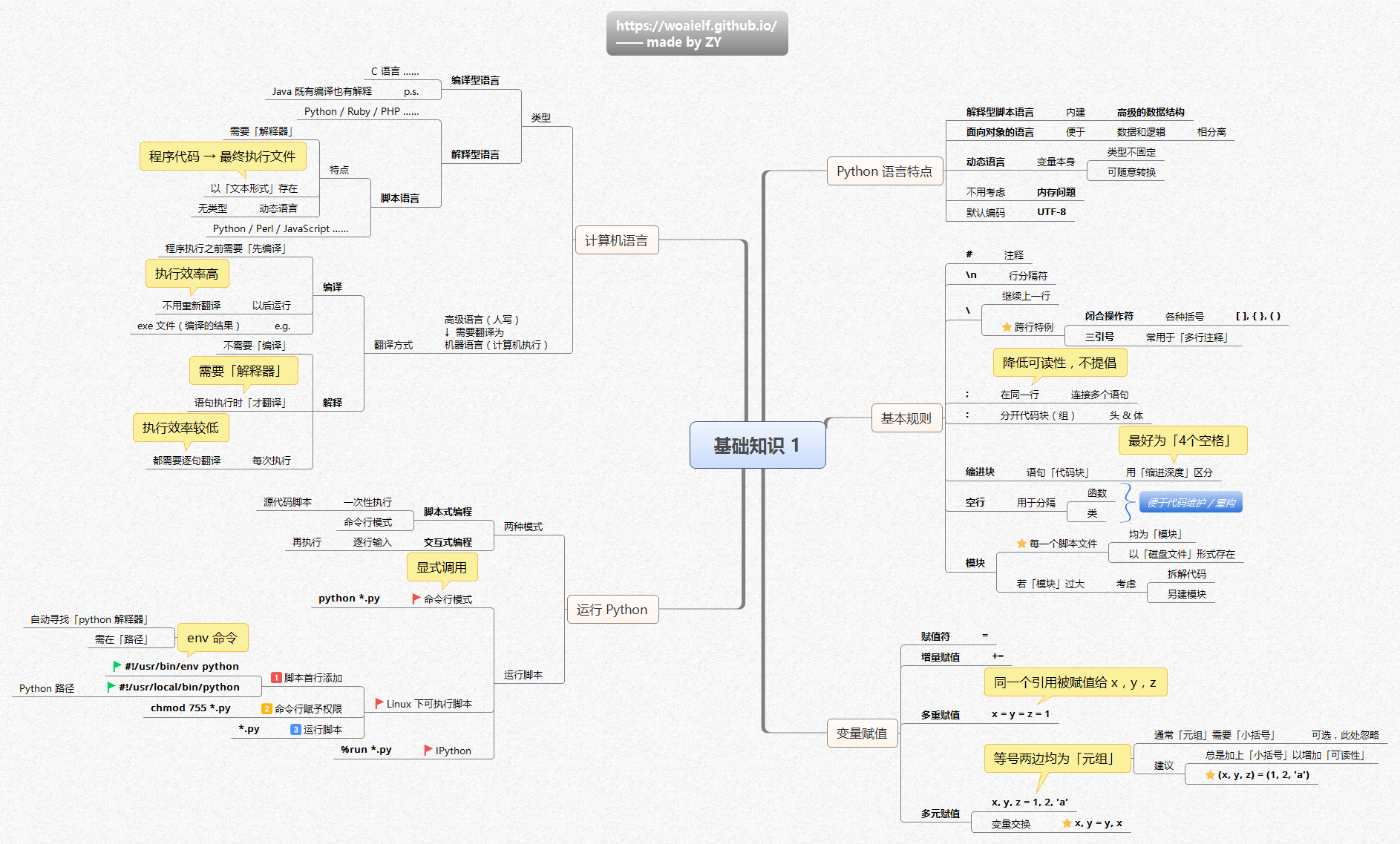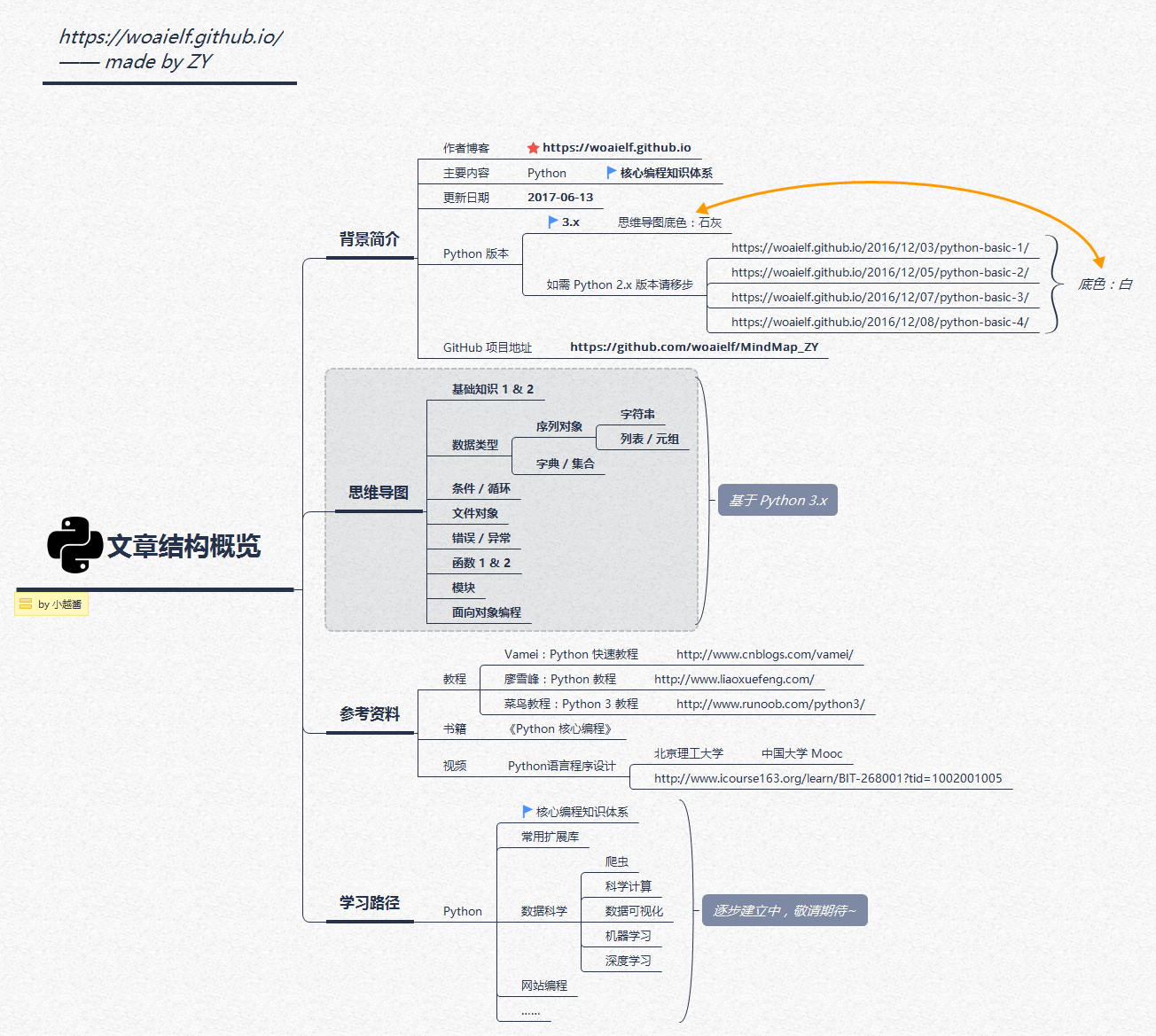 - 如需基于 Python 2.x 版本的笔记,可移步博客:https://woaielf.github.io (详见「总览」思维导图)。