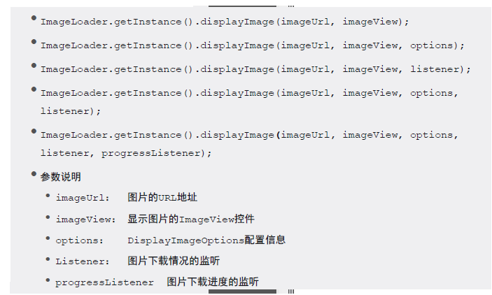1 //带监听器的加载 2 ImageLoader.getInstance().loadImage(stUrl,new SimpleImageLoadingListener(){ 3 //加载成功 4 @Override 5 public void onLoadingComplete(String imageUri, View view, Bitmap loadedImage) { 6 //为加载成功的时候设置成功的图片 7 imageView.setImageBitmap(loadedImage); 8 } 9 //加载失败时调用 10 @Override 11 public void onLoadingCancelled(String imageUri, View view) { 12 //为加载失败的时候设置失败的图片 13 imageView.setImageResource(R.mipmap.img_def_error); 14 super.onLoadingCancelled(imageUri, view); 15 } 16 //正在加载时调用 17 @Override 18 public void onLoadingStarted(String imageUri, View view) { 19 //为正在加载时的时候设置正在加载时的图片 20 imageView.setImageResource(R.mipmap.pictures_no); 21 super.onLoadingStarted(imageUri, view); 22 } 23 });