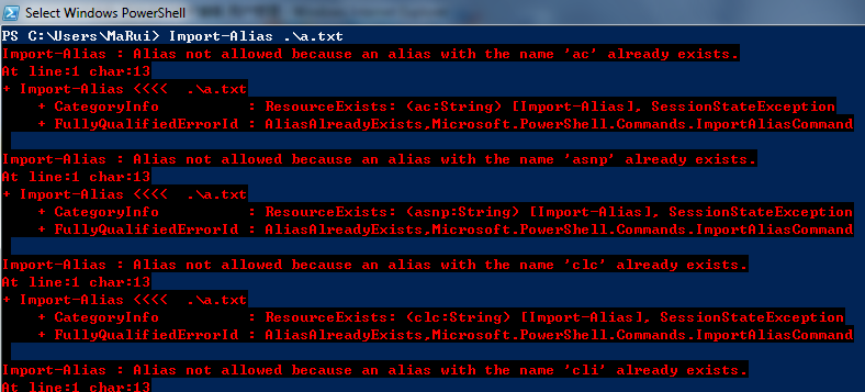 其实如果一个cmdlet存在alias,那么再次导入就会产生这样的杯具。