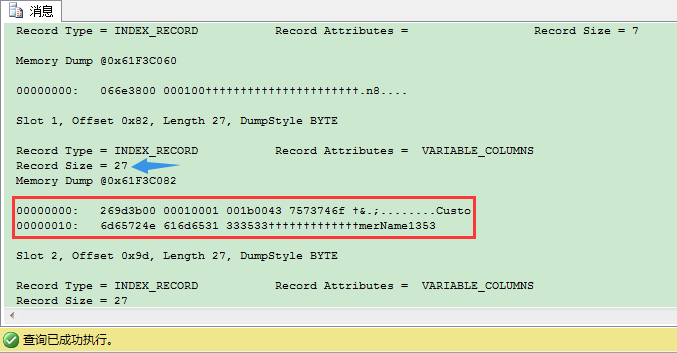 - 1b00 这2个字节代表每个变长列结束为止的偏移量。每个变长列需要2字节。这个和在数据页里存储变长列一致。这里我们有1个变长列,因此SQL Server需要1个 2 byte的偏移量——27 byte的偏移量。这就是说下一个字节一直到27 byte的偏移量都是我们变长列(聚集键)的组成部分。