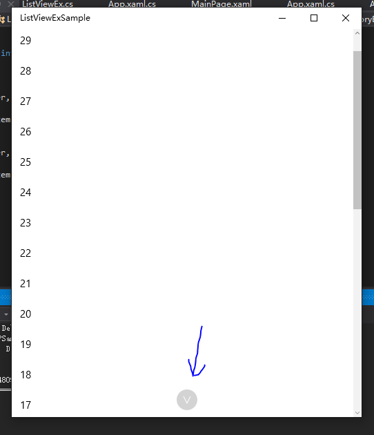 <Grid> <local:ListViewEx x:Name="listViewEx" ItemsSource="{x:Bind Items}" LoadHistoryEvent="ListViewEx_LoadHistoryEvent"></local:ListViewEx> <Grid Margin="10" VerticalAlignment="Bottom" HorizontalAlignment="Center" Tapped="Grid_Tapped" Visibility="{x:Bind listViewEx.GoBottomVisiblity,Mode=OneWay}"> <Ellipse Fill="LightGray" Width="30" Height="30"></Ellipse> <Polyline Stroke="White" Points="10,10 15,20 20,10"></Polyline> </Grid> </Grid>