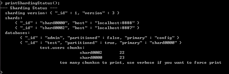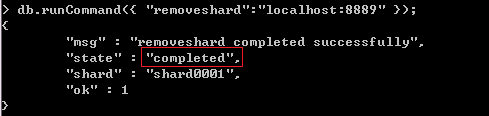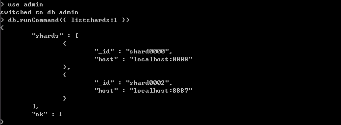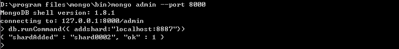 D:\program files\mongo\bin>mongo admin --port 8000 MongoDB shell version: 1.8.1 connecting to: 127.0.0.1:8000/admin > db.runCommand({ addshard:"localhost:8887"}) { "shardAdded" : "shard0002", "ok" : 1 }