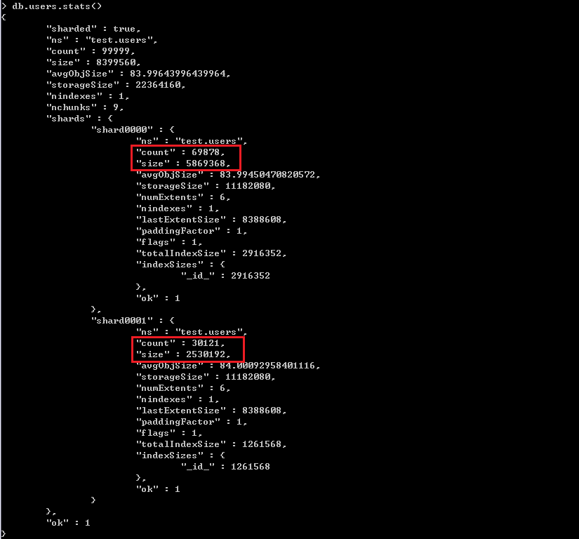 > use test switched to db test > db.users.stats() { "sharded" : true, "ns" : "test.users", "count" : 599998, "size" : 50399116, "avgObjSize" : 83.99880666268888, "storageSize" : 102398720, "nindexes" : 1, "nchunks" : 42, "shards" : { "shard0000" : { "ns" : "test.users", "count" : 233266, "size" : 19594344, "avgObjSize" : 84, "storageSize" : 47822848, "numExtents" : 9, "nindexes" : 1, "lastExtentSize" : 14495232, "paddingFactor" : 1, "flags" : 1, "totalIndexSize" : 9723904, "indexSizes" : { "_id_" : 9723904 }, "ok" : 1 }, "shard0001" : { "ns" : "test.users", "count" : 230087, "size" : 19327336, "avgObjSize" : 84.00012169309869, "storageSize" : 33327616, "numExtents" : 8, "nindexes" : 1, "lastExtentSize" : 12079360, "paddingFactor" : 1, "flags" : 1, "totalIndexSize" : 9592832, "indexSizes" : { "_id_" : 9592832 }, "ok" : 1 }, "shard0002" : { "ns" : "test.users", "count" : 136645, "size" : 11477436, "avgObjSize" : 83.99455523436643, "storageSize" : 21248256, "numExtents" : 7, "nindexes" : 1, "lastExtentSize" : 10066176, "paddingFactor" : 1, "flags" : 1, "totalIndexSize" : 7684096, "indexSizes" : { "_id_" : 7684096 }, "ok" : 1 } }, "ok" : 1 } >