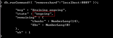 例如要移除8889端口的shard Server, 需要不停地调用以下命令来观察这个移除操作执行到哪里了.