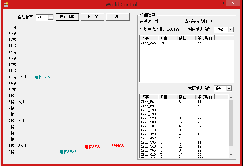 展现一个运行过程还是挺有趣的,发现自己的调度算法还是很愚蠢,上下班高峰总有那么几个楼层的人等电梯等的很惨烈……