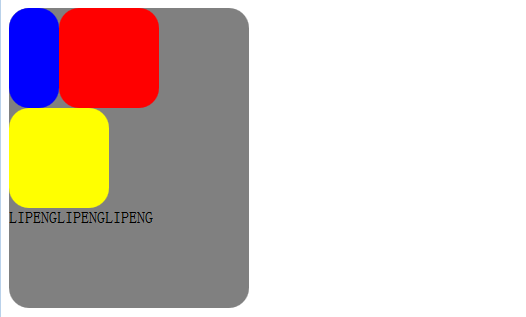 <style type="text/css"> #div1{ height: 100px; width: 50px; background-color: blue; border-radius: 20px; float: left; } #div2{ height: 100px; width: 100px; background-color: red; border-radius: 20px; float: left; } #div3{ height: 100px; width: 100px; background-color: yellow; border-radius: 20px; float: left; } #continer{ height: 300px; width: 240px; background-color:gray; border-radius: 20px; float: left; } </style>