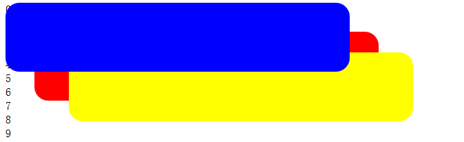 <style type="text/css"> #div1{ height: 100px; width: 500px; background-color: blue; position: fixed; border-radius: 20px; z-index: 2; } #div2{ height: 100px; width: 500px; left: 50px; top: 50px; background-color: red; position: fixed; border-radius: 20px; z-index: 0; } #div3{ height: 100px; width: 500px; left: 100px; top: 80px; background-color: yellow; position: fixed; border-radius: 20px; z-index: 1; } </style>