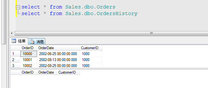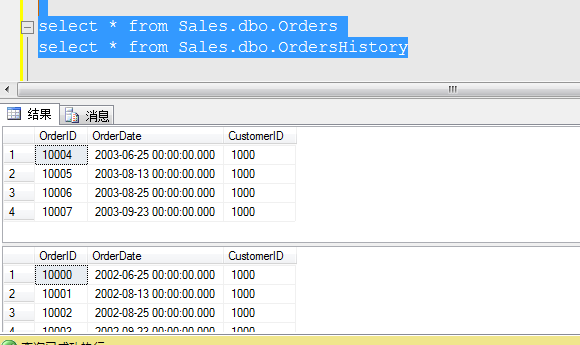 这时候Orders表只剩下2003年的数据,而OdersHistory表中包含了2002年的数据。