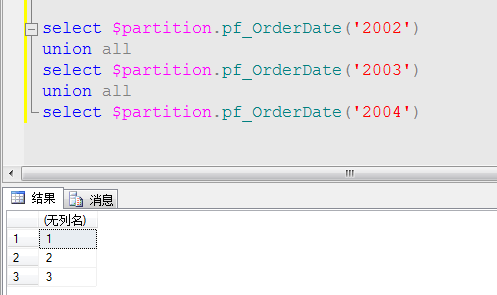 select $partition.pf_OrderDate(OrderDate) as Patition,COUNT(*) countRow from dbo.Orders group by $partition.pf_OrderDate(OrderDate)