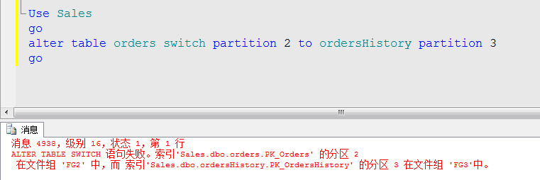 这里需要注意的是我们按照区进行数据修改的时候,必须是同一种分区函数下的分区表进行操作,并且分区结构相对应,如果不这样会报错,例如: