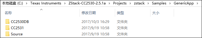 再点进一层目录,进入到C:\Texas Instruments\ZStack-CC2530-2.5.1a\Projects\zstack\Samples\GenericApp目录下,可以看到该目录下有3个文件夹,分别为:CC2530DB、CC2531和Source,如下图所示: