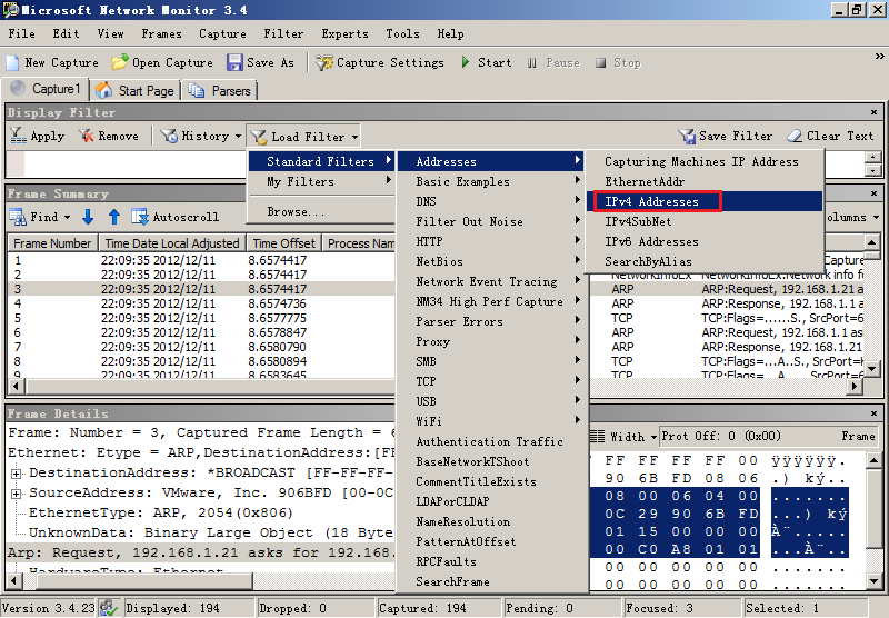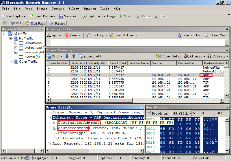 在Frame Summary窗格,找到ARP帧。展开下方的Frame Details窗格,检查详细信息,例如:DestinationAddress和SourceAddress字段。