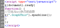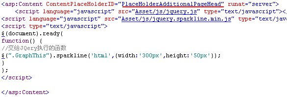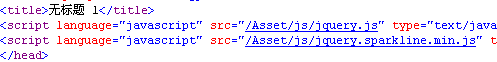 好了。现在就可以进行jQuery相关工作了。切换到代码视图,在页面<head>节中添加对jQuery库和Sparkline库的引用。在本例中,我将这两个文件放在了一个名为Asset的文档库的js文件夹下。