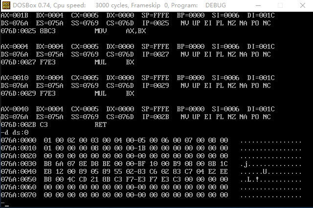assume cs:code data segment dw 1,2,3,4,5,6,7,8 dd 0,0,0,0,0,0,0,0 data ends code segment start: mov ax,data mov ds,ax mov si,0 mov di,16 mov cx,8 s: mov bx,[si] call cube mov [di],ax mov [di].2,dx add si,2 add di,4 loop s mov ax,4c00H int 21H cube: mov ax,bx mul bx mul bx ret code ends end start