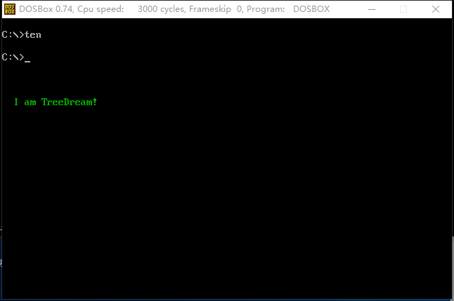 assume cs:code data segment db 'I am TreeDream!',0 data ends code segment start: mov dh,8 mov dl,3 mov cl,2 mov ax,data mov ds,ax mov si,0 call show_str mov ax,4c00H int 21H show_str: push dx push cx push ax push ss push si mov ax,0B800H mov es,ax ;用于显示的栈段 mov al,0a0h dec dh ;行数以0标号 mul dh ;行的偏移 mov bx,ax mov al,2 ;dos显示一列占两个字节 dec dl mul al add bx,ax ;显示的起始地址计算完 mov di,0 ;数据段指针 mov si,0 mov al,cl ;cx用于循环 s: mov ch,0 mov cl,ds:[di] jcxz ok ;判断cx是否为0 mov ch,al mov es:[bx+si],cx ;显示 add si,2 inc di jmp short s ok: pop si pop ss pop ax pop cx pop dx ret code ends end start