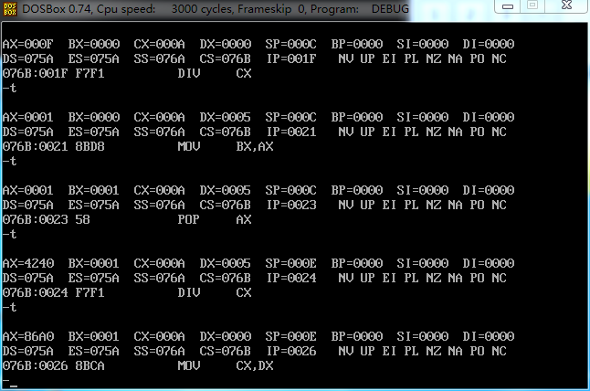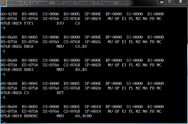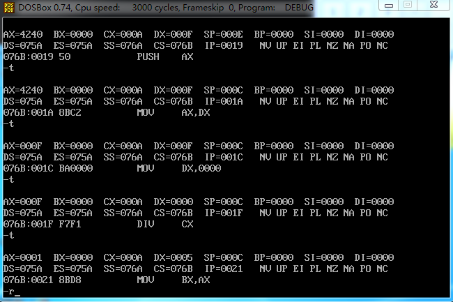 assume cs:code,ss:stack stack segment dw 8 dup (0) stack ends code segment start: mov ax,stack mov ss,ax mov sp,16 mov ax,4240H mov dx,00fH mov cx,0aH call divdw mov ax,4c00h int 21h divdw: push ax mov ax,dx mov dx,0 div cx mov bx,ax pop ax div cx mov cx,dx mov dx,bx ret code ends end start